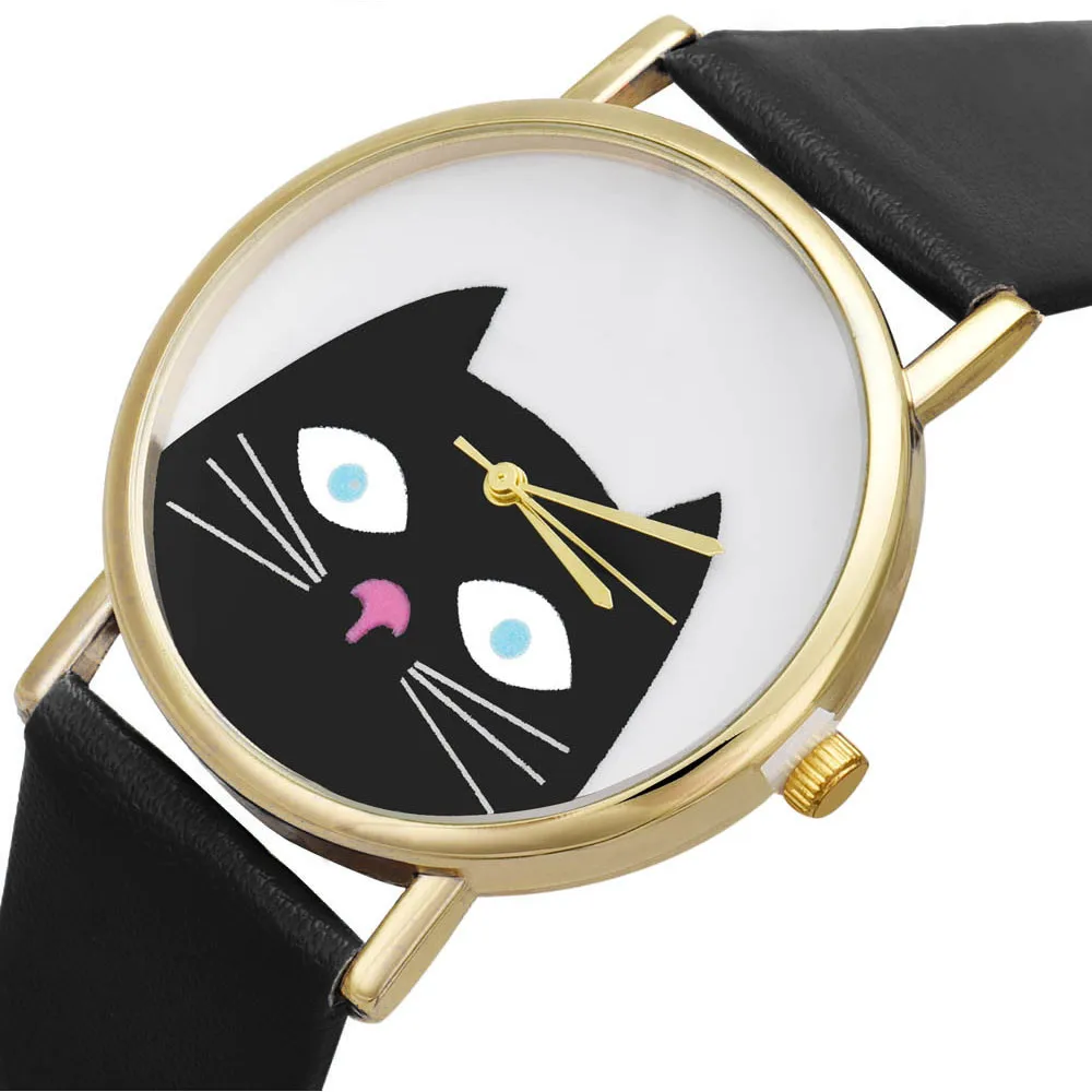 Cat Women Men Leather Band Analog Quartz Dial Wrist Watch Black